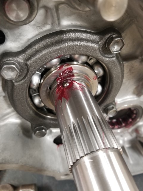 We start by putting some assembly grease on the cage bearing and slipping it onto the output shaft.