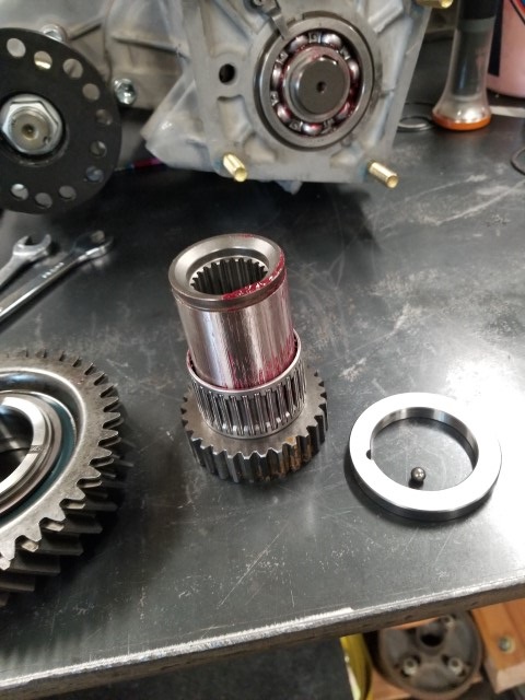 Fish the doubler coupler from the box from marlin. Add a little grease and slip the cage bearing and factory low range gear on.