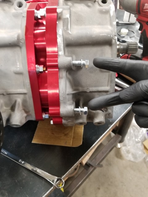 Now that the shift rods and low range fork are installed, put the gasket in place, and slip the reduction housing on. Install the two front bolts. Take care when installing the bolts as there are two different length bolts, 47mm and 49. The 49mm bolts is the one used to install the oil sling cover bracket. If you don't have the bracket anymore(as most people take them off) make sure to use a spacer or relocate the longer bolt, as it can crack the housing if you just thread it in.